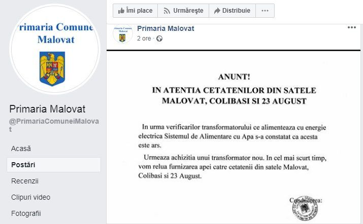 „Am verificat, sâmbătă și duminică întreaga rețea, pentru a fi siguri că care este problema la rețeaua de alimentare cu energie electrică, s-a constatat că acel transformator este ars, avem un certificate în acest sens de la firma care asigură mentenanța. Astăzi de dimineață am făcut achiziția pe SEAP a unui nou transformator și sperăm ca în maxim 2 – 3 zile să poată fi livrată apă locuitorilor afectați din satele Malovăț, Colibași și 23 August”, a precizat primarul comunei Malovăț, Ion Michescu.