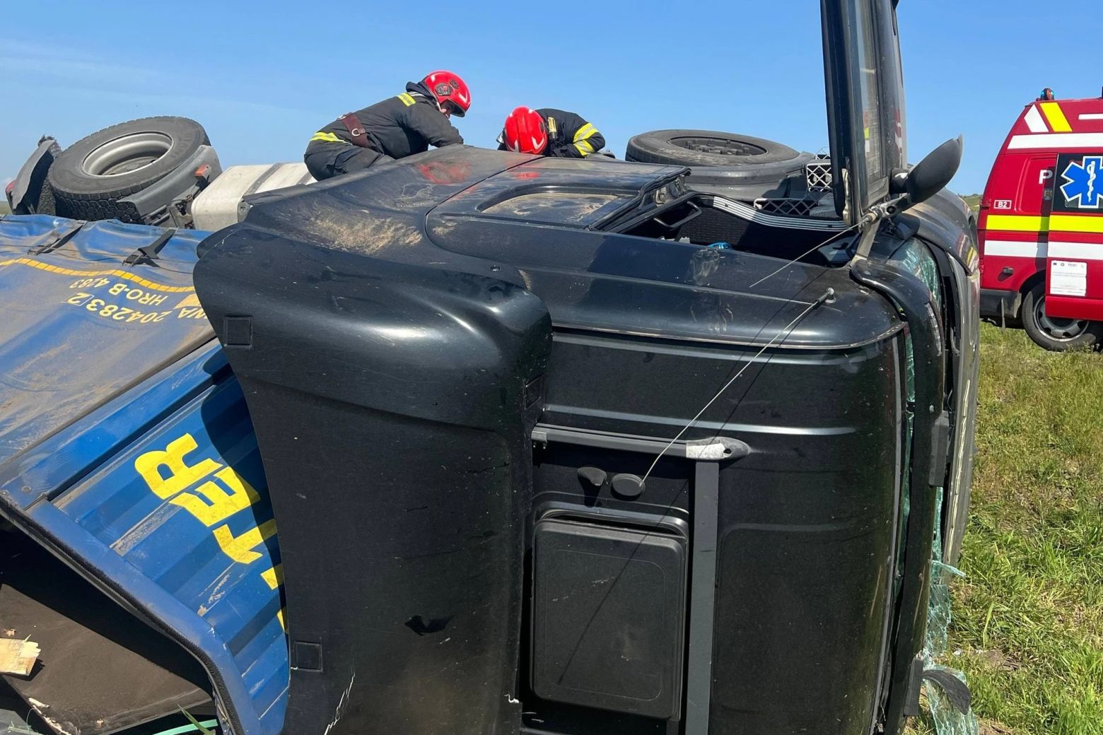 Un accident rutier a avut loc joi, în județul Mehedinți, după ce un autotren încărcat cu tuburi metalice s-a răsturnat în afara carosabilului. Conducătorul auto s-a evacuat singur și a fost preluat de medici pentru îngrijiri medicale.