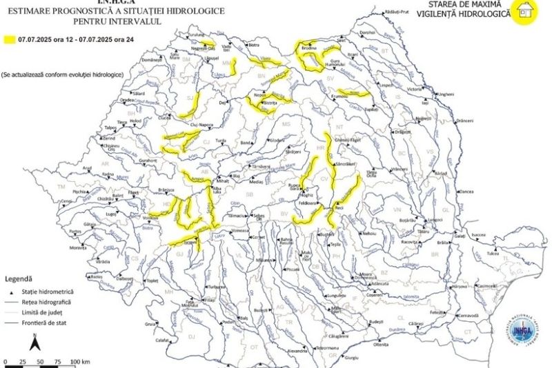 Institutul Național de Hidrologie și Gospodărire a Apelor (INHGA) a emis o atenționare de Cod Galben pentru ziua de luni, între orele 12:00 și 24:00, vizând 15 județe din țară care se confruntă cu un risc ridicat de inundații locale și viituri rapide pe râurile mici.