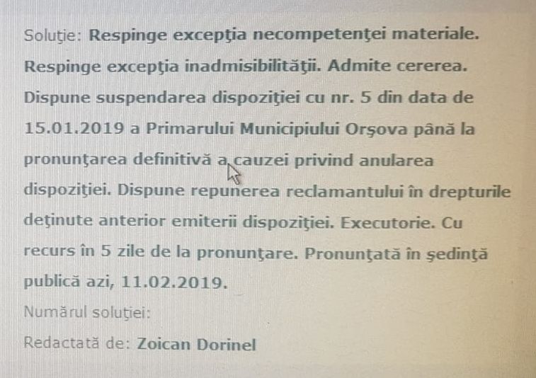 Adrian Cican, managerul demis pe 15 ianuarie de către primarul Marius Stoica, se întoarce la conducerea Spitalului Municipal Orșova. Așa au decis magistrații de la Secția Contencios a Tribunalului Mehedinți.