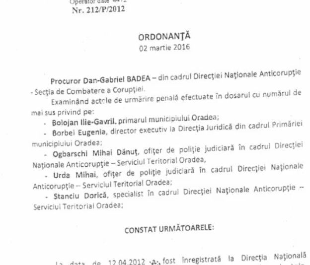 „Se va dispune clasarea față de Bolojan Ilie-Gavril și Borbei Eugenia, director executiv la Direcția Juridică din cadrul Primăriei municipiului Oradea, sub aspectul săvârșirii infracțiunii de folosire, în orice mod, direct sau indirect, de informații ce nu sunt destinate publicității ori permiterea accesului unor persoane neautorizate la aceste informații [...] întrucât fapta nu există.”, se mai arată în documentul procurorilor. (Sursa: Ordonanța de clasare din 2 martie 2016).