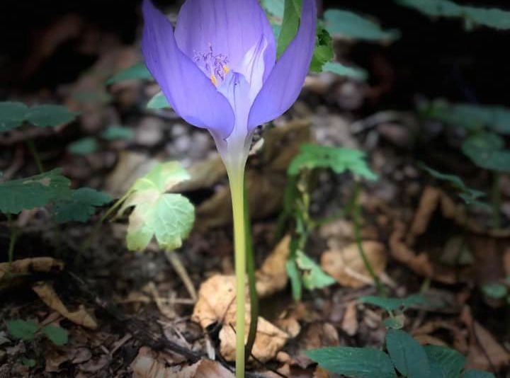 Niște flori albastru-movalii răsar din covorul de frunze uscate, parcă încercând să sfideze toamna. Este până la urmă și o invitație la plimbare în acest colț super al Mehedințiului.