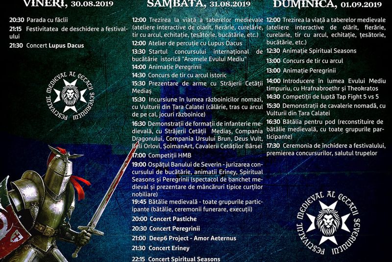 Programul festivalului este plin de surprize: demonstraţii de lupte cavalereşti, muzică medievală, ateliere de fierărie, încălţăminte, curelărie, crestături în lemn, ţesut la război, crotorie şi broderie, fabricare de zale, ateliere interactive , expoziţii de arme şi armuri.