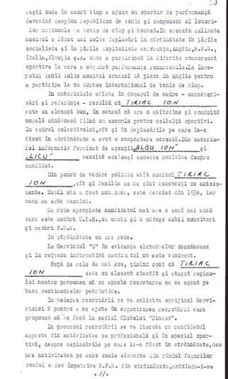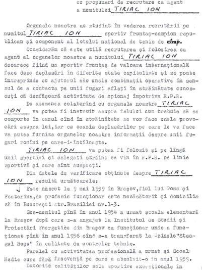 Considerăm că este utilă recrutarea și folosirea ca agent al organelor noastre a numitului ȚIRIAC ION deoarece fiind un sportiv fruntaș de valoare internațională face dese deplasări în diferite state capitaliste și se poate (pot, n.r.) întreprinde cu ajutorul său unele combinații operative în sensul de a contacta pe unii fugari aflați în străinătate cunoscuți că desfășoară activitate de spionaj împotriva R.P.R. (...) ȚIRIAC ION va putea fi instruit asupra felului cum trebuie să se comporte (...), va putea fi folosit și pe lîngă marii sportivi și delegații străini ce vin în R.P.R. pe linie sportivă și care sînt suspecți. (...)
