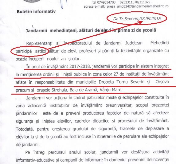 „În anul de învățământ 2017 – 2018, jandarmii vor participa în sistem integrat la menținerea ordinii și liniștii publice în zona celor 27 de instituții de învățământ aflate în responsabilitate din municipiile Drobeta Turnu Severin și Orșova , precum și orașele Strehaia, Baia de Aramă și Vînju Mare”.