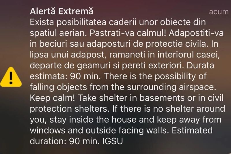 Populația din zona de nord-est a județului Tulcea a primit un mesaj RO-Alert, o inițiativă menită să informeze cetățenii despre posibilitatea căderii unor obiecte din spațiul aerian. Mesajul îi îndeamnă pe destinatarii acestuia să își păstreze calmul și să se adăpostească în beciuri sau adăposturi de protecție civilă.