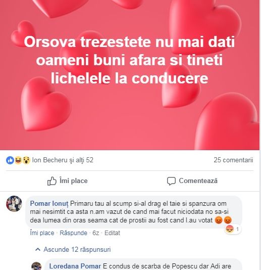 Postarea Loredanei Pomar a capacitat un număr mare de comentarii, toate negative la adresa primarului Marius Stoica. Situația e cu atât mai stupidă, cu cât distinsa doamnă este unul dintre orșovenii care l-au ales pe Stoica și care a crezut în el. E foarte curios de văzut dacă Stoica își va amenda toți alegătorii, până la finele mandatului. Din păcate, primarul Orșovei nu a droit să comenteze incidentul.