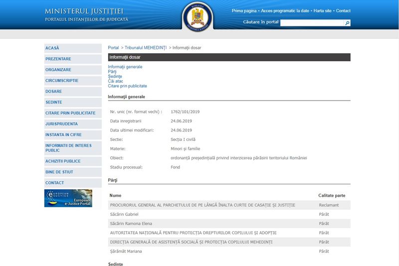Cererea de ordonanță președințială a Procurorului general al României a apărut deja pe rolul Tribunalului Mehedinți și are numărul 1762/101/2019. Cererea a fost înregistrată la Secția I Civilă – Minori și familie și are ca pârâți Autoritatea Națională pentru Adopție, DGASPC Mehedinți, soții Ramona și Gabriel Săcărin, precum și pe asistenta maternală Mariana Șărămăt. Bogdan Licu a solicitat interzicerea părăsirii teritoriului României de către Sorina, minora adoptată de o familia Săcărin.