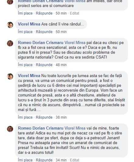 „Nu toate lucrurile pe lumea asta se fac de față cu presa, va urma un comunicat pentru presă, a fost o ședință de lucru cu 6 dintre cei mai importanți specialiști pe arhitectură muzeală și reconversie din Europa. Vom face un comunicat de presă, asta e o altă chestiune, atelierul de lucru s-a ținut în 3 puncte din oraș cu teme diferite, stai liniștit că nu e nimic de ascuns, dimpotrivă....numai că proiectele se mai și fură...”,