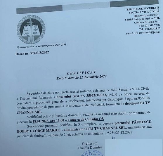 În urma Adunării Generale a Acționarilor din 19 decembrie 2022, noul administrator al societății B1 Channel SRL este Bobby Păunescu. Co-acționarul Sorin Oancea este acuzat de fapte deosebit de grave, delapidare și evaziune fiscală. În plus, pe rolul instanței a fost deschisă procedura de intrare în insolvență, având ca termen de judecată 18 ianuarie 2023.