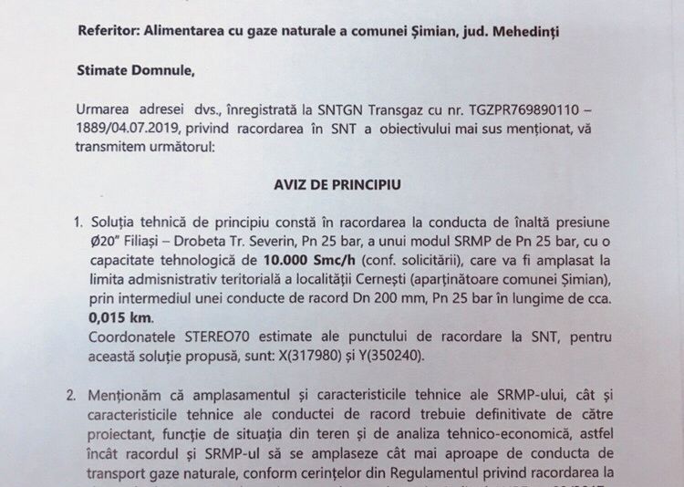 Primarul de la Șimian, Constantin Trușcă, anunță că a primit avizul de principiu de la Societatea Națională de Transport Gaze Naturale TRANSGAZ SA pentru alimentarea cu gaze a mai multor localități aparținătoare comunei Șimian. Este vorba de Șimian, Cerneți, Dudașul Cernețiului și Dedovița Nouă.