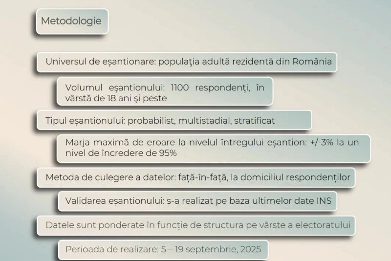 Sondajul CURS din septembrie 2025 arată un public dominat de pesimism, cu încredere ridicată în instituțiile considerate stabile și de protecție, dar cu scepticism pronunțat față de politicieni și instituțiile politice. În plan electoral, AUR se află pe primul loc, urmat de PSD și PNL, într-un context economic perceput ca dificil de majoritatea populației.
