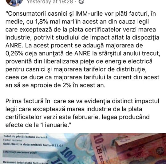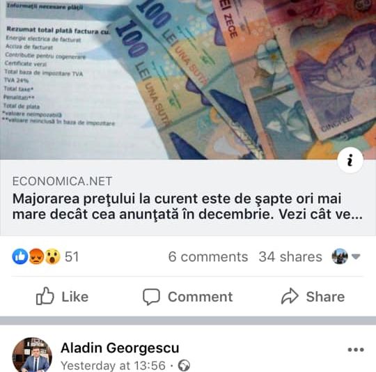 Preşedintele Consiliului Judeţean Mehedinţi, Aladin Georgescu (PSD), a distribuit miercuri pe Facebook, o știre din ianuarie 2015 care anunţa creşterea preţurilor la energie, precum şi faptul că acest lucru se va vedea în factura din luna februarie.